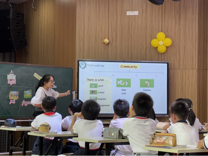 接着柯森森老师执教PEP 3 Unit 3 Places we live in A Lets talk, 以陈杰的视角带着学生认识陈杰的社区,引导学生社区里有什么,我们能在社区里做什么,从课本迁移到学生自己并说一说自己的社区。通过预测,小组讨论等充分调动孩子们的思维和积极性。